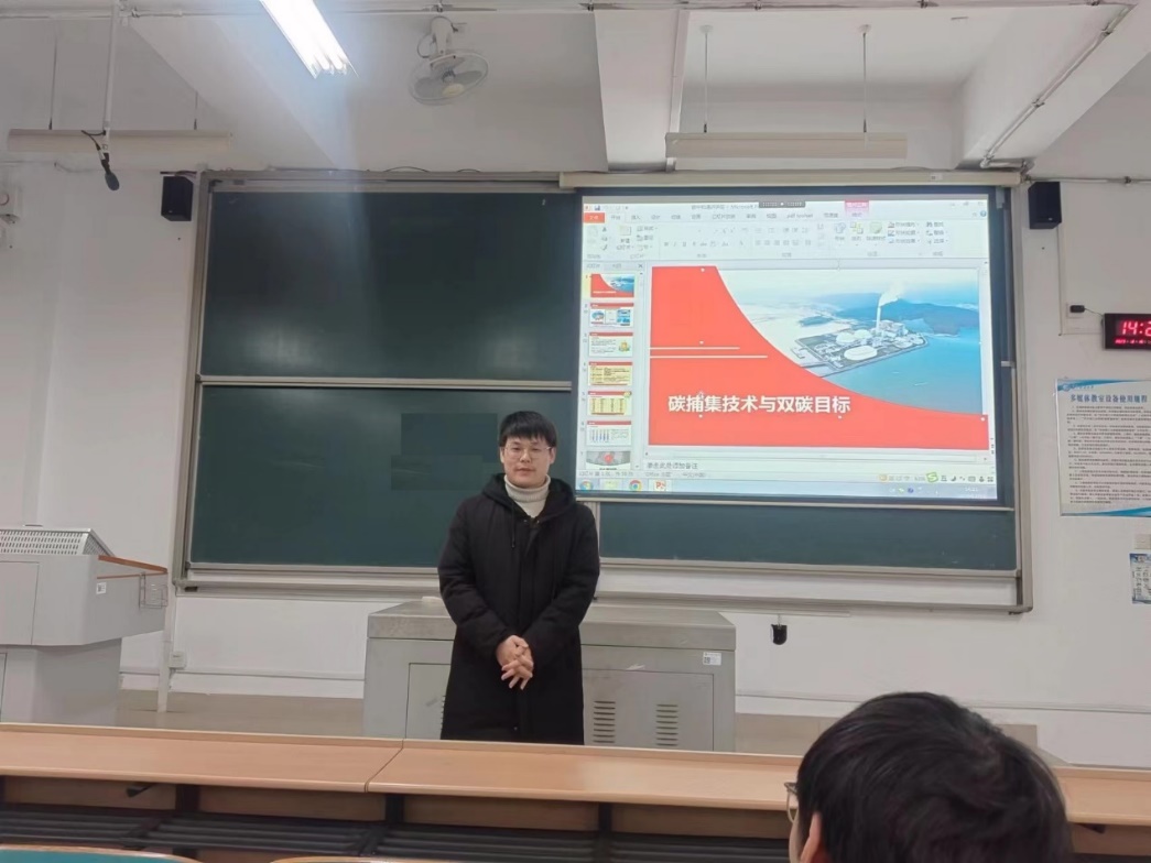 郑文超博士结合分享了个人的成长经历,向同学们介绍了双碳目标及碳捕获技术的内涵。他强调碳捕获技术于双碳目标的重要性,更阐明了化学化工相关专业应当如何参与到国家的双碳目标中去。郑博士鼓励各年级同学结合自身兴趣,参加与到与碳捕集相关的科研中去,以丰富大学生活,培养创新精神。