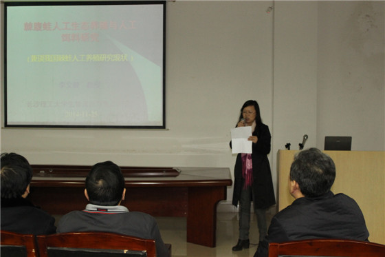 报告首先介绍了以棘腹蛙为代表的两栖类动物在农业技术产业化应用所取得的成果,并就全国各地实现规模化人工养殖所取得的示范和推广进行了阐述。李教授还详细地介绍了目前全国人工养殖棘腹蛙的技术瓶颈,以及他二十多年来所攻克的一系列技术难关,尤其是人工饵料研发方面所取得的重大突破,并在推广和应用过程中创造的可观经济价值。李教授还回顾了从事两栖类动物研究几十年来的心得体会和经验,勉励年轻的老师要沉下心来做学问,脚踏实地做科研。报告深入浅出,形象生动,会场反响热烈。