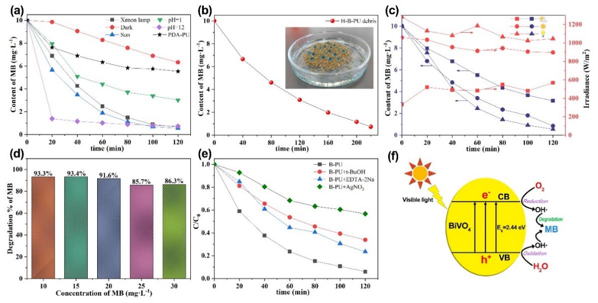 改性海绵在可见光的照射下2 h内对于亚甲基蓝等有机染料具有优良的降解性能,同时功能化的钒酸铋改性的聚氨酯海绵对轻油、重油和有机溶剂具均有优异的分离性能和吸附效率,并且该材料能循环使用,相关材料在分离净化工业含油和有机染料废水方面具有广泛的应用前景。
