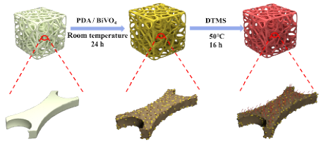 具有特殊润湿性转换的疏水/亲水多孔吸附材料因其能够高效分离处理含油和染料的废水而取得了广泛的关注。戴益民副教授/万丽博士课题组研究制备了一种新型聚氨酯海绵复合材料,利用聚多巴胺的强粘附性将钒酸铋纳米颗粒固定在聚氨酯海绵上,获得具有微纳米表面结构的钒酸铋改性的海绵, 并且利用十二烷基三甲氧基硅烷对相关材料进行改性获得了高疏水性的海绵。