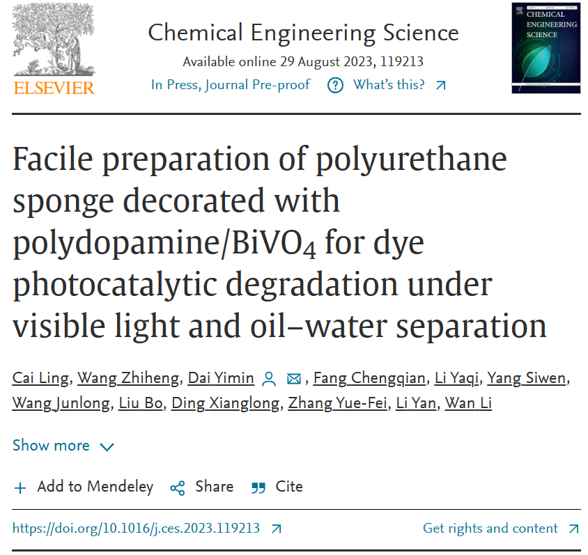 近日,国际化工领域三大顶级期刊之一《Chemical Engineering Science》以“Facile preparation of polyurethane sponge decorated with polydopamine/BiVO4 for dye photocatalytic degradation under visible light and oil-water separation”为题在线发表了我院戴益民副教授/万丽博士课题组在功能磁性纳米复合材料的制备及其在化工废水深度治理方面最新研究成果。该工作首次报道了一种具有光催化/油水分离协同作用的聚氨酯海绵的制备方法及在可见光条件下高效降解化工废水中有机染料及同时进行油水分离的研究。