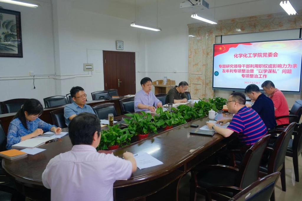 4月20日下午,化学化工学院在工科三号楼B318会议室召开党委会,专题研究领导干部利用职权或影响力为亲友牟利专项整治暨“以学谋私”问题专项整治工作。学院全体党政领导班子参加会议,会议由党委书记宋刘斌主持。