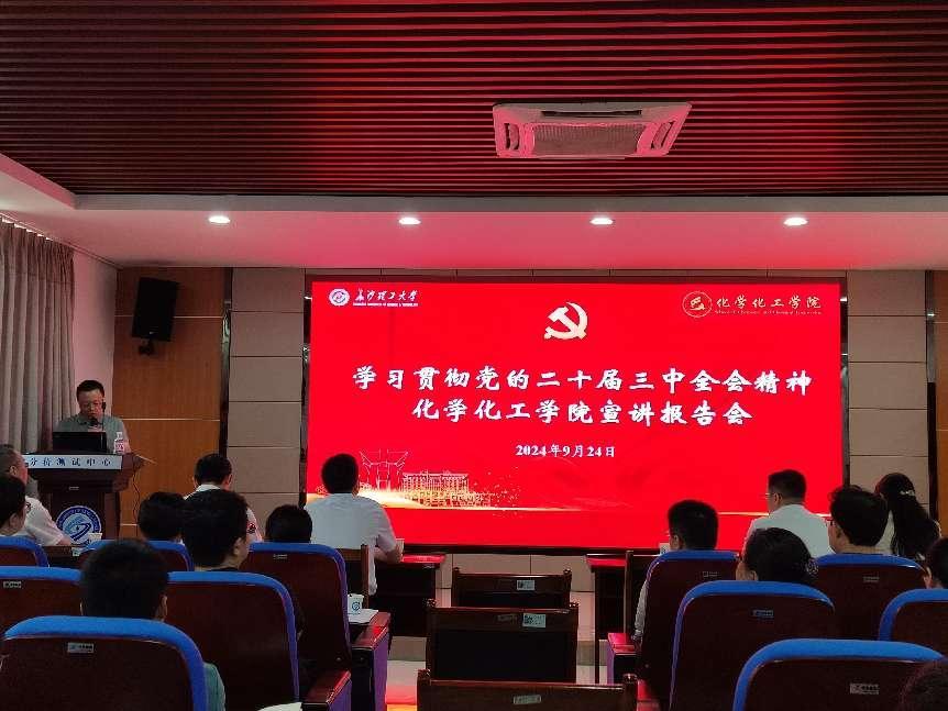 2024年9月24日下午,化学化工学院在新能源大楼3B-301会议室开展学习贯彻党的二十届三中全会精神宣讲报告会。学校组织部常务副部长、党校常务副校长陈曦作宣讲报告。学院全体院领导班子及教职工参会,会议由党委书记宋刘斌主持。