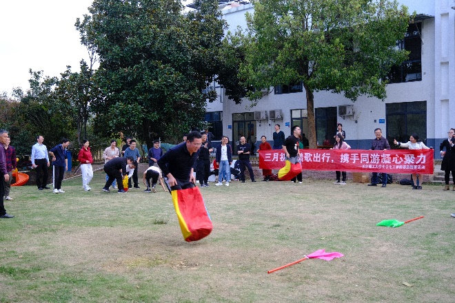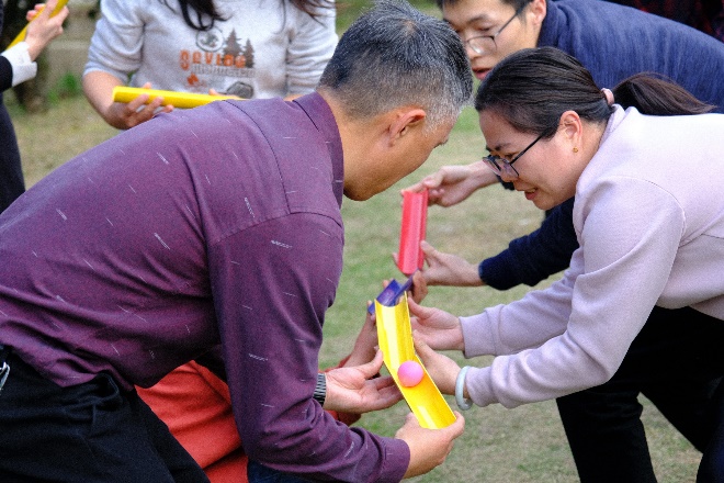 随后迎来了本次春游的重要环节——野外素质拓展活动。本活动共有三十多位老师参加,旨在帮助青年教师快速融入学院大家庭,提升老师们的团队凝聚力,强健体魄。在教练的带领下,老师们一共分为“雄鹰队”、“狂飙队”、“乘风破浪队”三个队伍。在进行了充分热身之后,老师们迎来了“PVC管运球接力”、“袋鼠跳接力”、“小球滚滚环游世界” 三项团队合作任务。老师们纷纷展现了体能优势和脑力风暴,不急不躁、稳谋应对,顺利地完成了各项任务。最终“狂飙队”队如其名,获得了本次比赛的冠军。在素质拓展活动中,老师们通力协作、顽强拼搏、不断突破自我,充分体现出了我院教师出色的团队默契。本活动不仅丰富了大家的文化生活,还进一步增强了团队凝聚力,有助于今后老师们更好地为学院的发展共同出谋献力。