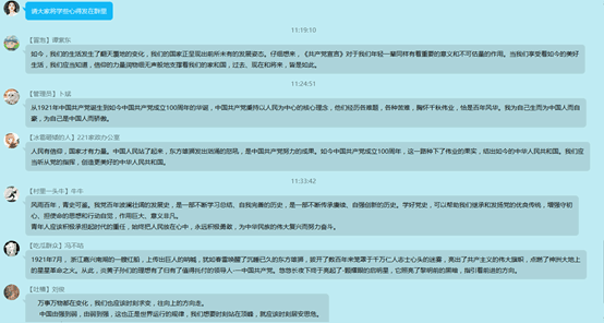 配合着紧凑丰富的活动节奏,层出不穷的活动形式,各班级共同组织观看《百年恰是风华正茂》与《习近平讲述的故事“半条被子”的温暖》,同学们围绕“启航新征程”,结合学风建设、文明宿舍创建、养成教育等展开了积极热烈的讨论和分享,重点探讨分享了如何坚定理想新联,扬好青春风帆,担好时代责任,练就过硬本领。其中,许多大四学生在外出实习的情况下仍通过特别的方式进行了党史学习。例如,生物1701班等班级采用线上形式开展班会,确保将会议精神传达到每一位同学,环工1701班则开展线上积极热烈的主题讨论,十分新颖并且参与度高。