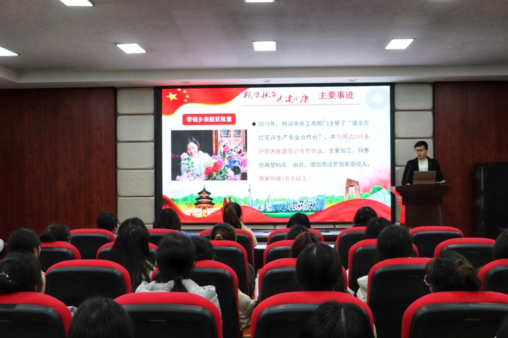 回望纵横捭阖的百年历史、波澜壮阔的沧桑巨变,唯有初心历久弥坚。化学学院食品支部的三位同志分享了三位巾帼英雄的先进事迹。其中刘咏翰同志向大家讲述了“让妈妈回家”苗绣创业培训基地负责人石佳的故事。来自湘西的她,怀揣着“要让更多妇女在家门口就业”的信念返乡创业,带领妇女用巧手“绣”出美好新生活,用自己独特的方式践行了“乡村振兴”战略。李超智同志为我们带我们走进“轮椅女孩”杨淑亭的故事,胸部以下高度高位截瘫的她并没有向命运屈服,而是选择勇敢“站起来”,创办“残疾人之家”带领更多人创业脱贫。她从创业中实现了自己人生价值,用一颗赤子之心助力家乡脱贫攻坚,以实际行动向大家证明了自身的美丽与坚强。