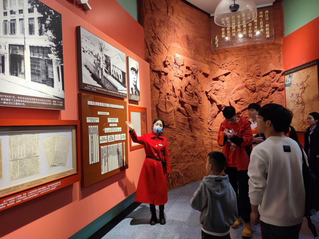 走进展厅,映入眼帘的便是名为“潇湘魂”的毛泽东、刘少奇、任弼时三位伟人的巨幅雕像,其上方醒目的“敢教日月换新天”七个大字令人精神振奋。整个展厅分为四个部分,前三部分按照历史发展脉络,分别以“开辟新天地”、“描绘新画卷”、“谱写新篇章”为题,展现了湖湘儿女在党的领导下于新民主主义革命、社会主义全面建设和改革开放三个历史时期的光辉奋斗历程。第四部分为“三湘群英谱”的专题展,主要介绍以毛泽东为代表的湘籍和长期在湘工作的著名党史人物。在馆内工作人员的详细讲解下,学生们慢走、诚听、细看,重温过往不平凡的岁月,缅怀先烈的英雄事迹,感受伟人的奉献精神,自觉接受历史文化的洗礼。他们不但为湖湘子弟在党的历史和国家发展进程中发挥的关键作用感到骄傲,为新民主主义革命时期前仆后继的党员的英勇正气所震撼,为新中国成立以来党领导下三湘大地的快速发展和繁荣昌盛感到自豪,也在心里给自己敲响了一记“学史明理、学史增信、学史崇德、学史力行”的警钟。