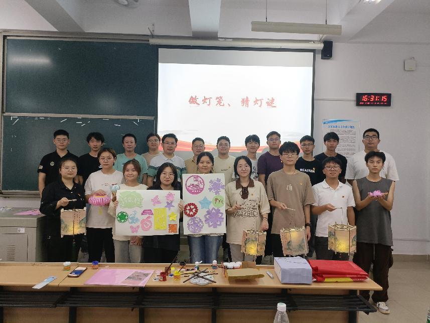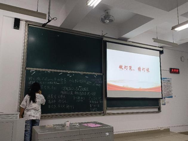 党课结束后,在场师生联合开展实践活动,通过小组的形式完成活动任务。实践活动中,学生们在黑板上写下各类有趣的灯谜,师生一起猜灯谜,现场氛围活跃。