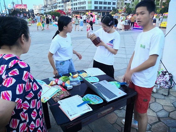 活动伊始,精心准备的开场舞吸引了广场上众多休闲的居民。实践队员带领他们一一参与展会的活动区域。知识普及宣传区内居民认真聆听工作人员的讲解,也有青年人对当地的环境状况各抒己见;“一站到底”区内,可以看到有很多当地居民垃圾分类知识熟记于心,轻松拿到纪念品;并且经常言传身教,让自己家的孩子从小养成垃圾分类的习惯以及培养垃圾分类的意识;环保酵素区内,真正诠释了“兴趣是最好的老师”这句话,大家怀着好奇心想一探究竟。团队成员对环保酵素的制作方法及益处进行讲解,并且赠送一些提前准备好的环保酵素给当地居民。