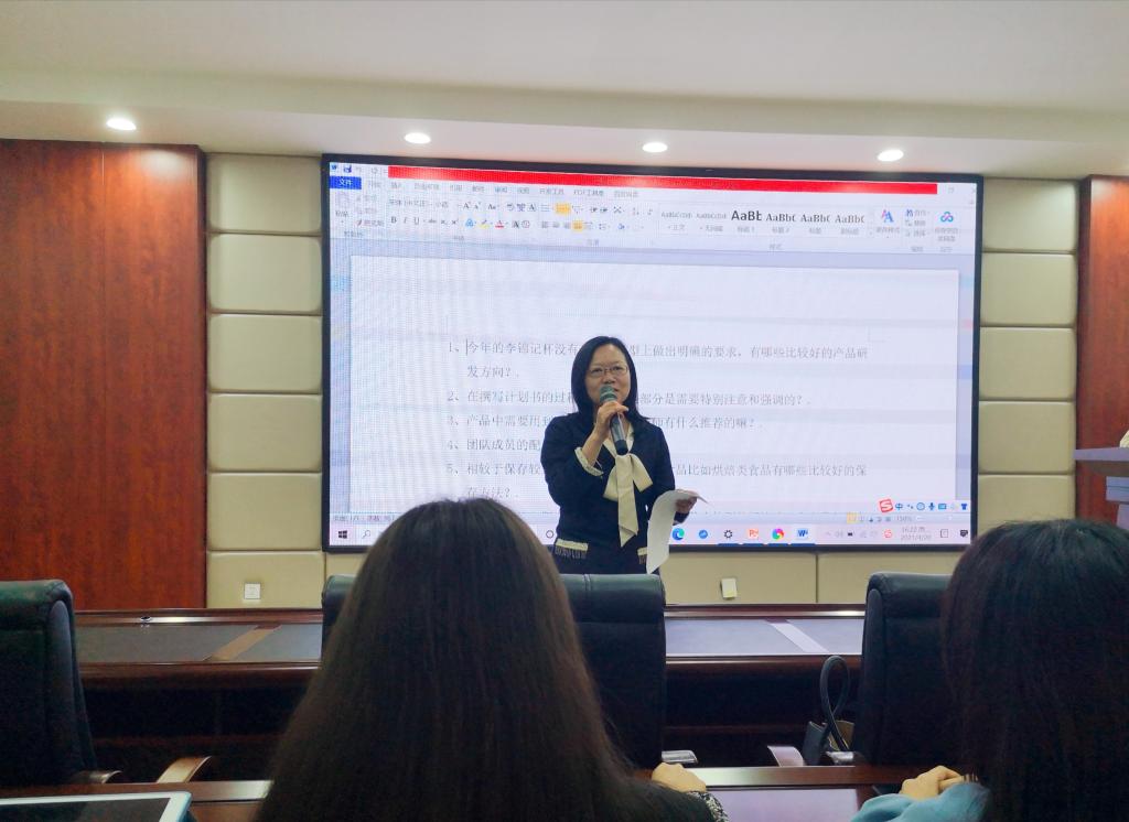 程云辉作现场宣讲并结合参赛同学提出的10个问题一一进行解答。她根据评审细则对产品带有地域特色这一创新性给出了建议,强调了产品加工工艺、配方合理性等方面的重要性。她也希望同学们在产品保质期和杀菌处理方面能保持严谨态度,避免因产品提前腐败变质引起不能顺利参赛的不利局面。