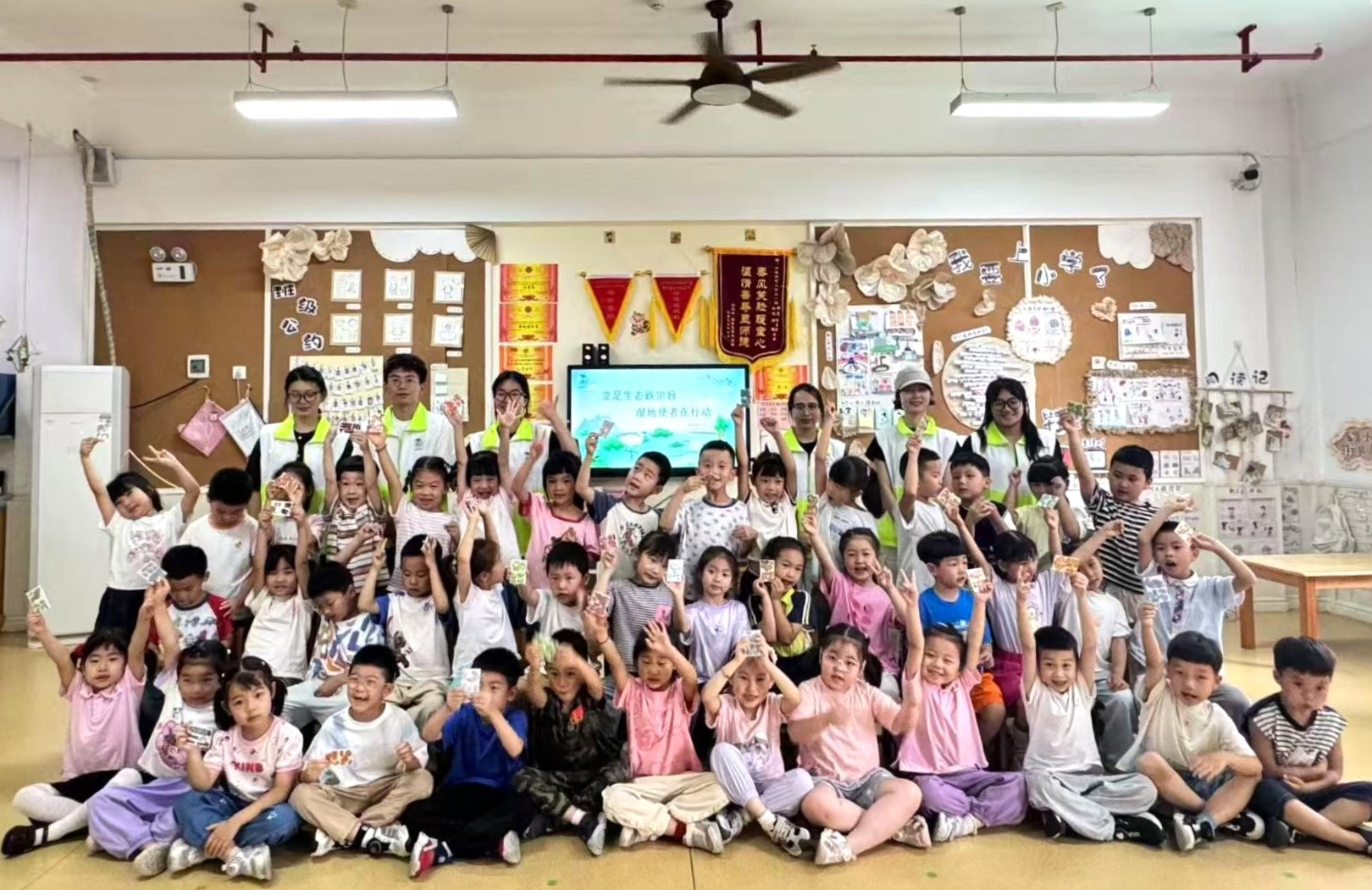 “我的湿地该是什么样子?”在创意绘画环节,孩子们挥动彩笔,将想象中的湿地美景跃然纸上——有的画下清澈湖水中游动的小鱼,有的描绘绿树环绕的湿地栈道,还有的用彩虹色勾勒出“会呼吸的湿地”。随后,孩子们争先恐后上台分享:“湿地是小鱼的家,我要画好多水草给它们”“垃圾分类后,地球妈妈会更漂亮!”稚嫩的童言中,生态保护的萌芽悄然生长。