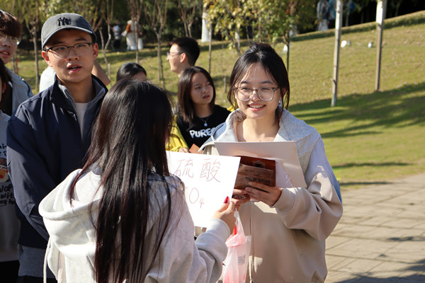 活动现场设置了五个任务站点,每个站点均围绕化学知识设计,兼具趣味性与教育性。在“漆扇工坊”环节,参与者通过识别实验操作卡牌中的错误,掌握规范操作与安全知识;“女巫的糖果”环节则以化学元素为主题,考验学生对元素特性的理解与团队默契;“DDDD谐音挑战”以轻松幽默的方式帮助学生记忆化学术语;“方程式速填”和“实验仪器你说我猜”则分别锻炼学生的计算能力与表达协作能力。为兼顾不同专业背景的学生,活动还设置了难度调整机制,确保每位参与者都能顺利参与并有所收获。
