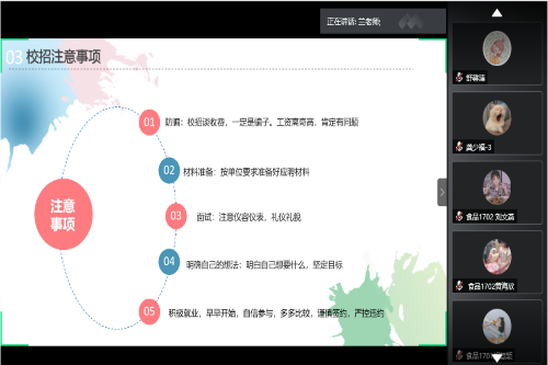 会议伊始,兰贵辉致开场词,强调就业前期准备的重要性,提醒大家2021年就业形势会更加严峻,需要毕业生早作准备,积极参与。而后,兰贵辉分别从学院近三年就业率情况分析、就业前期准备、校招相关知识和其他重点事项等四个方面做了详细讲述。在就业前期材料准备工作中,兰贵辉提醒同学们务必在假期完成简历的制作,也要利用假期进行相关的实习实践活动丰富自己的简历内容;在校招相关知识的介绍中,兰贵辉指出,同学们一定要拓宽自己的信息获取渠道、积极参与招聘活动,在实践中提升自己的面试能力;最后,兰贵辉针对提高防范意识,避免求职陷阱问题,意向考公、入伍、考教师等其他就业选择同学求职选择问题等大家关心的热点问题进行了强调。讲解结束后,学生们积极留言提问,兰贵辉一一进行了详细解答,同学们纷纷留言感谢,会议取得圆满结束。