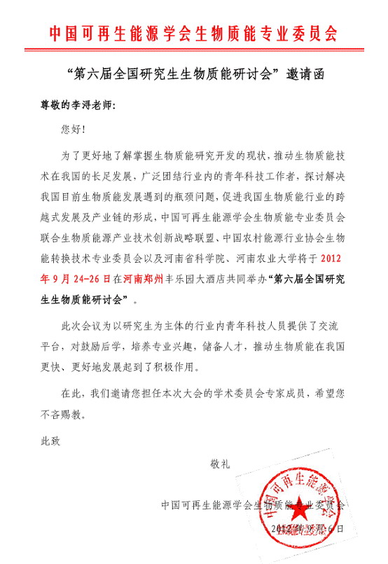2012年9月24 - 26日,“第六届全国研究生生物质能研讨会”在郑州举行。本次会议由中国可再生能源学会、全国生物质能源产业技术创新战略联盟、河南省科学院、河南农业大学主办。来自30多所国内著名高校和科研院所的200余名研究生以及科研工作者参加了研讨会。本次研讨会涉及生物质资源开发与政策、生物燃料技术、生物质成型及生物质发电技术、材料与化学品4个专题16个方向。我院李浔博士作为本次大会的学术委员会专家成员出席了此次会议,研究生黄玉娟同学的《双孔TiO2-Al2O3复合物氧化物的制备及表征》参加了学术交流。