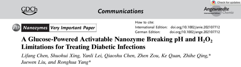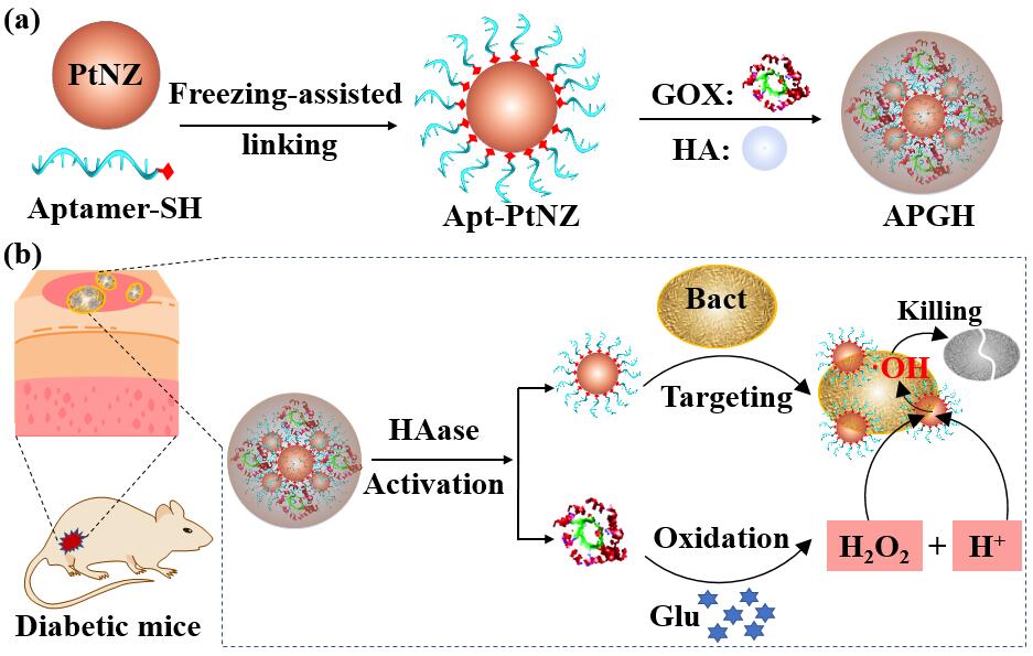 首先,基于DNA探针在铂纳米颗粒表面的高稳定性修饰和高保真信号释放的前期研究基础(Zhihe Qing, et al. Angew. Chem. Int. Ed. 2020, 59, 14044-14048; Zhihe Qing, et al. CCS Chem. 2020, 2, 1217–1230),卿志和博士课题组发展了一种细菌感染激活的纳米酶,在生理条件下同时打破局部pH和过氧化氢的限制,提高慢性伤口部位的抗菌效果。选取糖尿病伤口感染为研究模型,以DNA分子(细菌特异性核酸适体)功能化的铂纳米酶、葡萄糖氧化酶和透明质酸为组装单元,构建透明质酸酶(HAase)激活的纳米酶胶囊(APGH)。APGH在受感染的伤口中被细菌分泌的透明质酸酶激活,之后纳米酶通过表面修饰的核酸适体与细菌结合,葡萄糖氧化酶催化糖尿病伤口中高浓度的葡萄糖氧化,降低pH,补充过氧化氢,铂纳米酶在细菌表面原位生成·OH,提高了化动力学杀菌效果。APGH的活性转化与抗菌作用在体外实验和糖尿病伤口抗菌实验中得以验证。这种通过调控生理微环境以增强纳米酶活性的策略具有通用性,对促进纳米酶的生物学应用具有重要意义(Scheme 1)。该工作以“A Glucose-Powered Activatable Nanozyme Breaking pH and H2O2 Limitations for Treating Diabetic Infections”为题,于2021年8月10日发表在国际化学领域顶刊Angewandte Chemie,并入选VIP论文(Very Important Paper)和封面成果(Frontispiece),并被期刊官媒作新闻(News)报道。文章共同第一作者是威廉体育williamhill硕士生陈丽芳、硕士生邢硕晖和雷艳丽博士,通讯作者是卿志和副教授和杨荣华教授。文章链接:https://onlinelibrary.wiley.com/doi/10.1002/anie.202107712。