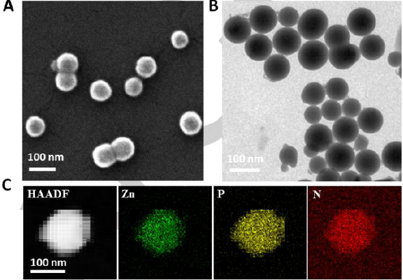 Scheme 2. Left: Schematic illustration of Zn2+-driven self-assembly of Zn2+ and RNA molecules. Right: (A) SEM image and (B) TEM image of the Zn-RNA NPs. (C) High angle annular dark field-scanning transmission electron microscopy (HAADFSTEM) image and the corresponding elemental mapping images of the Zn-RNA NPs.