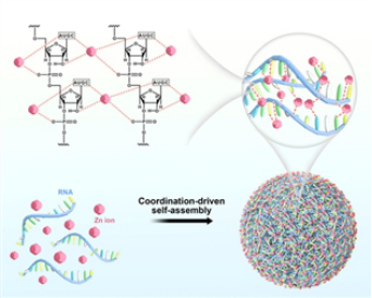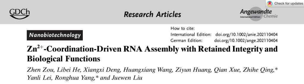 随后,基于核酸编码金属纳米材料的研究基础(Zhihe Qing, et al. Nano Today 2021, 36, 101021-101042; Zhihe Qing, et al. Angew. Chem. Int. Ed. 2013, 52, 9719-9722),卿志和博士课题组发展了一种Zn2+配位驱动的RNA纳米组装方法,实现功能RNA分子(mRNA、miRNA等)的细胞内高效递送。该方法操作简单,只需要将RNA分子和Zn2+在95℃下混合,即可获得具有球形形貌的纳米颗粒。由于高温消除了RNA复杂的二级结构,因此,该方法适用于不同组成、长度(从20到近1000个核苷酸)和结构的功能性RNA的包载,突显了其普适性。此外,相较于脂质体、阳离子聚合物、无机纳米载体等常用的RNA纳米载体,Zn2+配位驱动组装的RNA纳米颗粒具有优异的RNA包载量和转染效率。更重要的是,凝胶电泳、荧光光谱和ESI质谱等结果表明,包载的RNA保持了其结构的完整性;通过考察合成的绿色荧光蛋白基因mRNA纳米颗粒和抑癌miRNA纳米颗粒的生物学性能,发现Zn2+配位驱动的纳米组装体能够维持包载RNA的生物学功能,发挥高效的荧光信号报告作用和抗肿瘤作用(Scheme 2)。该工作以“Zn2+-Coordination-Driven RNA Assembly with Retained Integrity and Biological Functions”为题,于2021年8月17日发表在国际化学领域顶刊Angewandte Chemie,并被中国科学网和德国Willey数据库公众号(WilleyChem)采访报道。文章共同第一作者是邹振博士和硕士生贺丽蓓,通讯作者是卿志和副教授和杨荣华教授。文章链接:https://onlinelibrary.wiley.com/doi/10.1002/anie.202110404。