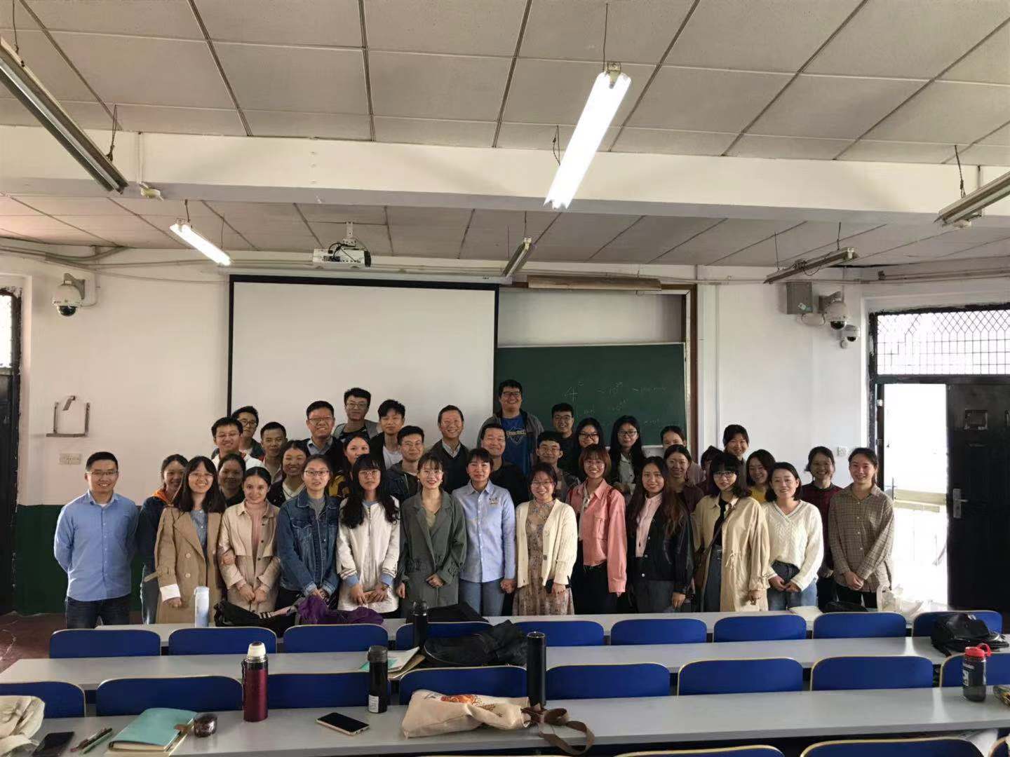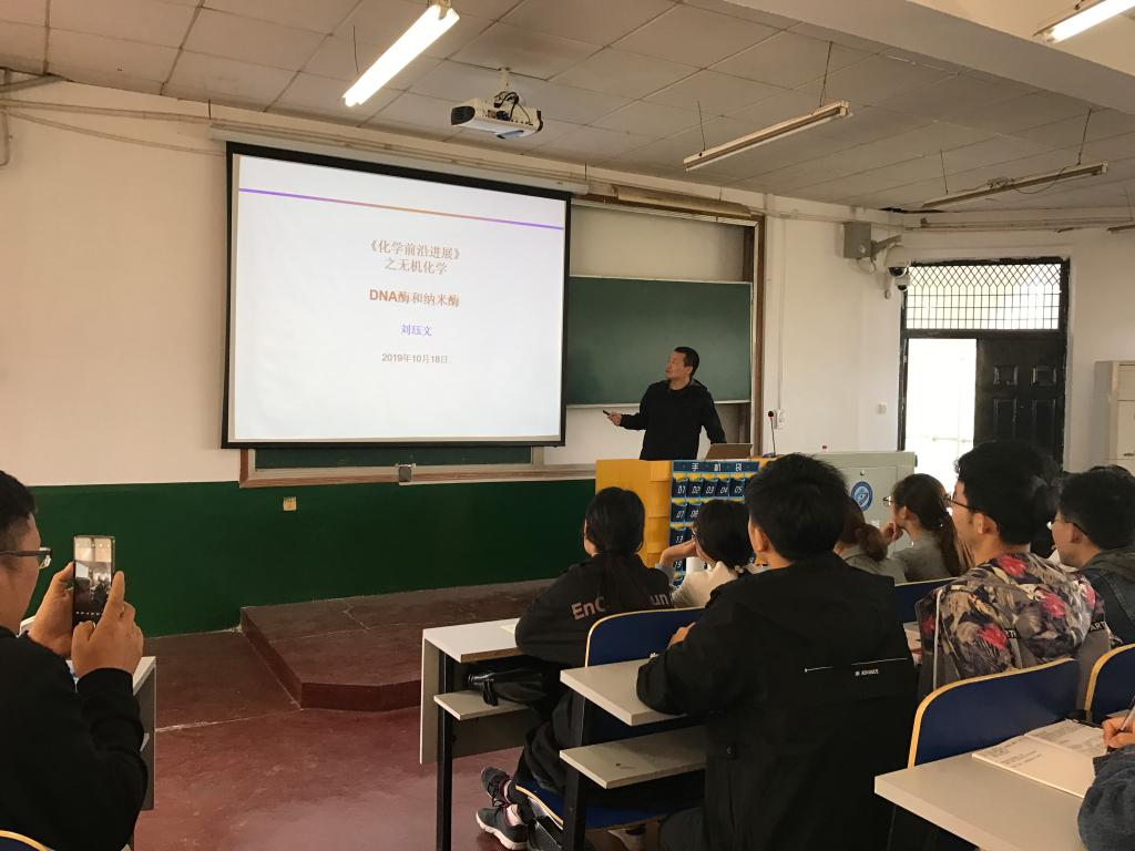 2019年10月18日8:00—11:40,在金盆岭校区十四教学楼4002教室,加拿大滑铁卢大学博士生导师刘珏文教授为化学与食品工程学院2019级化学、应化、化工专业研究生讲授《化学化工学科前沿》课程,授课内容为《化学前沿之生物无机化学—DNA酶和纳米酶》。