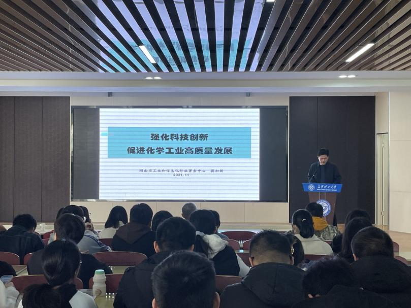 2021年11月25日10:00,应威廉体育化学化工学院邀请,湖南省工业和信息化行业事务中心副主任、正高级工程师蒋加新来威廉体育开展学术交流,在云塘校区工三A307做了主题为“强化科技创新,促进化学工业高质量发展”的名师学术讲座。讲座由电力与交通材料保护湖南省重点实验室主任曹忠教授主持,学院副院长张跃飞教授、陈启杰教授、喻林萍副教授,及学院教师和研究生百余人参加了学术讲座。