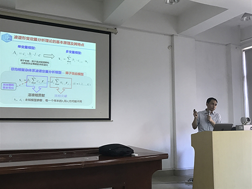 陈教授针对传统波谱分析理论中波谱校正模型和方法不适用于非均相复杂体系定量分析这一难题,基于化学计量学方法,从建立乘子效应模型、发展校正样本光谱乘子参数的估计方法、运用双校正策略预测溶液相和固相中组分含量等多方面系统构建了波谱形变定量分析新理论,开发了便捷通用的化学软件,并将这一新理论成功应用于实际生物传感应用中。陈教授深入浅出的讲解令聆听报告的师生们受益匪浅。