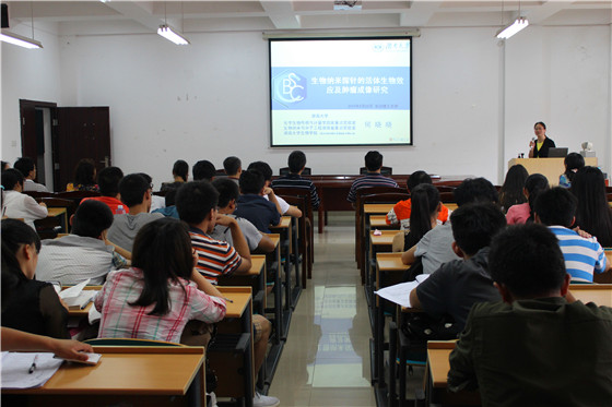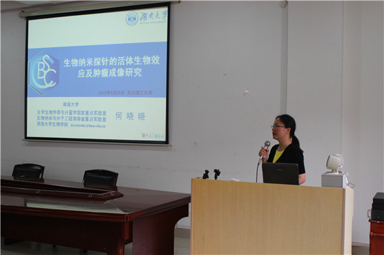 5月25日,应威廉体育williamhill化学与生物工程学院邀请,湖南大学化学生物传感与计量学国家重点实验室副主任、生物学院副院长、博士生导师何晓晓教授来威廉体育进行学术交流访问。上午10:00,何教授在云塘校区工科三号楼A-320会议室作了题为“生物纳米探针的活体生物效应及肿瘤成像研究”的学术报告,会议由化学学院副院长曹忠教授主持,曹教授首先代表学院向何晓晓教授的到来表示热烈的欢迎,接着介绍了何教授在生物功能化纳米材料及活体分子成像和药物控释载体领域所取得的重要成就。化学学院教师、研究生及本科生百余人聆听了报告。