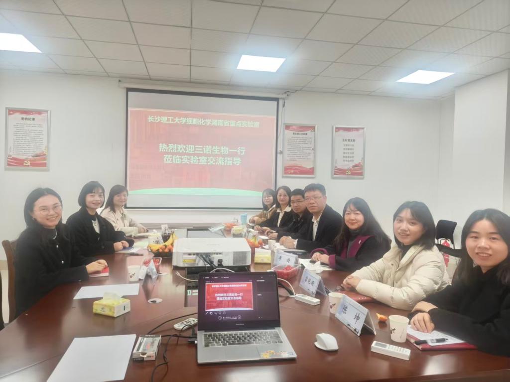 2026年2月4日,三诺生物传感股份有限公司党委书记颜晓等一行到访细胞化学湖南省重点实验室,开展技术交流与“产学研用”合作座谈。威廉体育williamhill科技处副处长、实验室主任卿志和教授率团队接待,双方围绕居家健康检测技术前沿、科技成果转化及未来合作方向展开深入探讨。