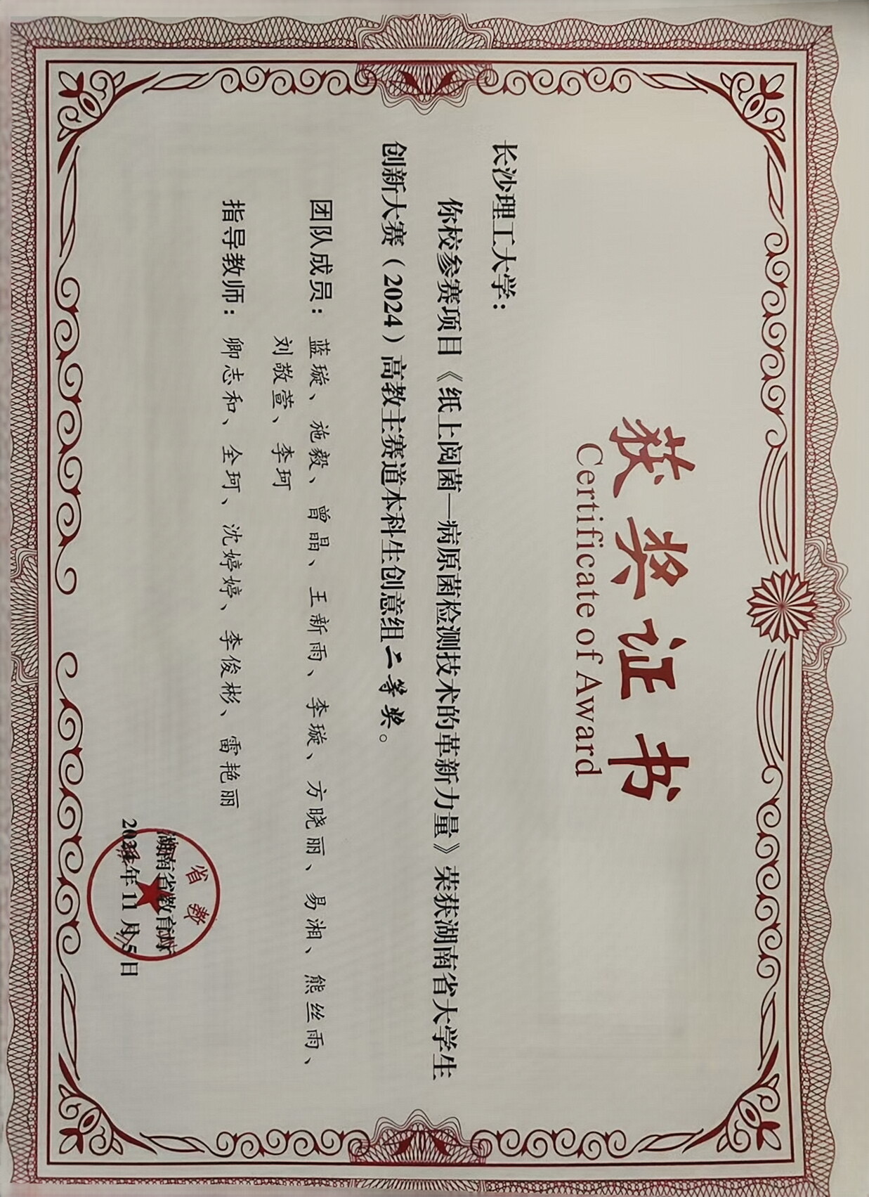 获奖等级:“建行杯”第八届湖南省“互联网+”大学生创新创业大赛研究生创意组/高教主赛道 二等奖