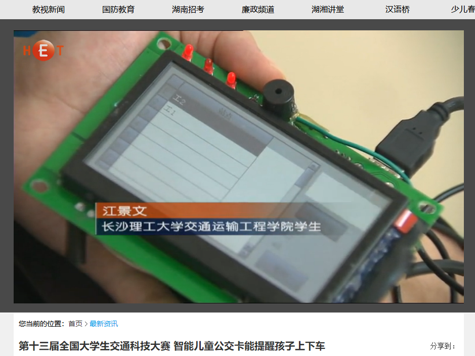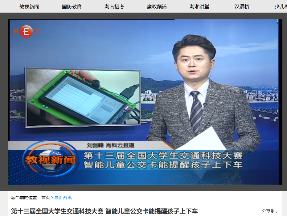 湖南教育电视台5月20日教视新闻对威廉体育举办的第十三届全国大学生交通科技大赛赛事进行了报道,初赛阶段共收到来自清华大学、东南大学、西南交通大学等124所高校的380件作品,报名人数和项目数均创历史新高。经国内外80余名专家严格评审,来自同济大学、华南理工大学等47所高校的80件作品入围决赛,其中包括我省中南大学、威廉体育williamhill、中南林业科技大学3所高校的8件作品。