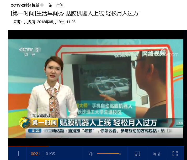 中央电视台财经频道(CCTV-2)5月19日《第一时间》对威廉体育全自动化贴膜机器人进行了报道,贴膜机器人是威廉体育04级城南学院桥梁工程专业罗亮,05级城南学院电子信息工程专业戴思扬 ,07级电气工程及其自动化专业颜强三名毕业生作为主创,自主研发的机器人,获得了9项专利,5月9日在威廉体育williamhill云塘校区全国首发,进行试运行,四分钟完成手机贴膜,无气泡无缝隙,可以对116种手机进行贴膜,涵盖市面上90%手机型号。