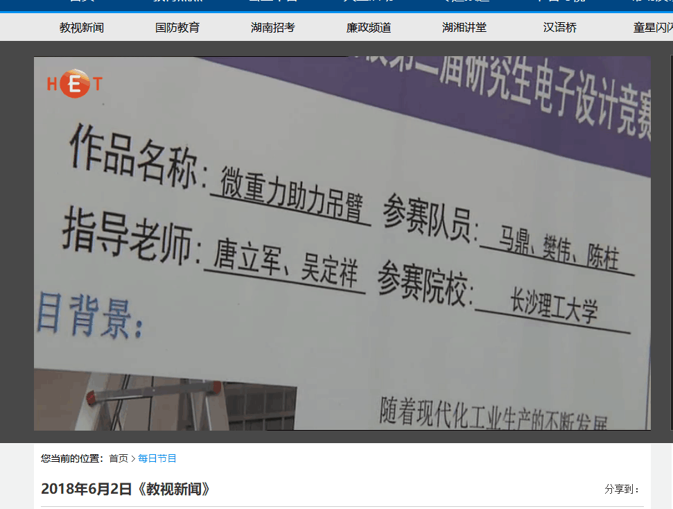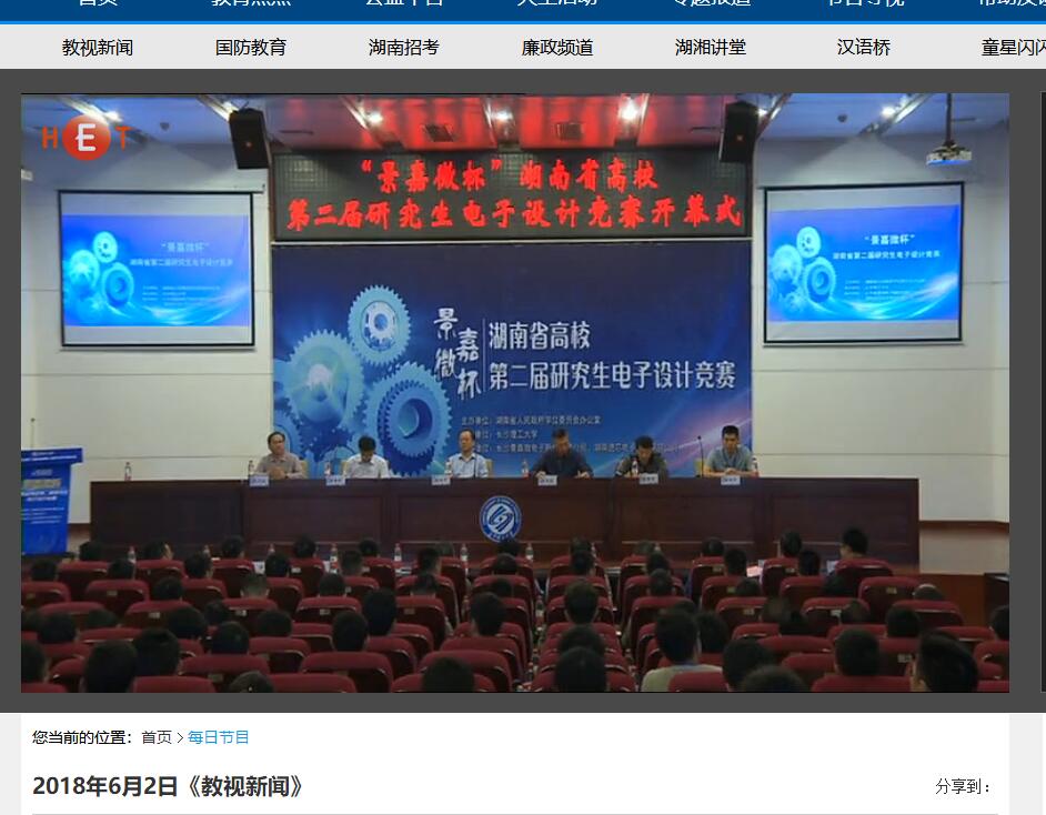 湖南教育电视台6月2日教视新闻11分30秒处,对威廉体育举办的湖南省高校第二届研究生电子设计竞赛进行了报道,湖南省高校研究生电子设计竞赛是由威廉体育发起,湖南省人民政府学位委员会办公室主办,面向全省高等院校研究生的团体性电子设计竞赛,首届与今年第二届比赛均由威廉体育承办,本次比赛来自中南大学、国防科技大学等14所高校的83支队伍参赛,威廉体育在此次竞赛中仍展现了较强的竞赛优势,获1个一等奖,2个二等奖,4个三等奖。由威廉体育物理与电子科学学院选送的作品“微重力助力吊臂”受到专家一致好评,获得了包括“景嘉微杯”团队一等奖、企业奖、优秀个人奖、优秀指导教师奖等比赛奖项。