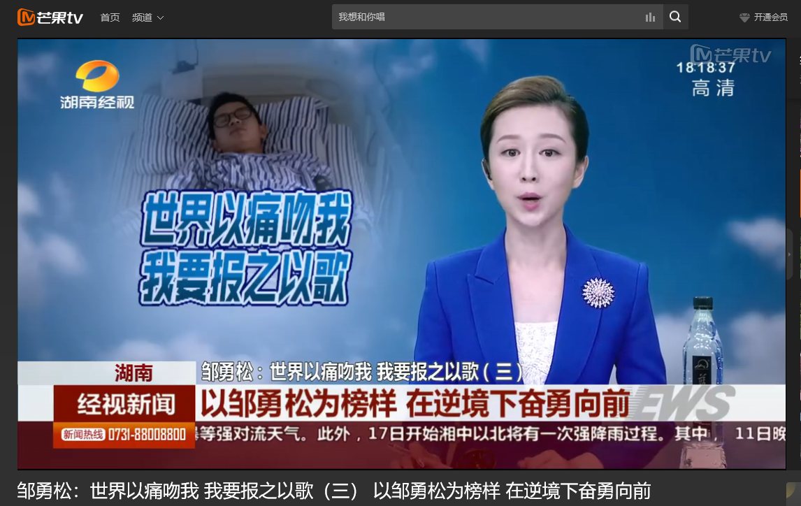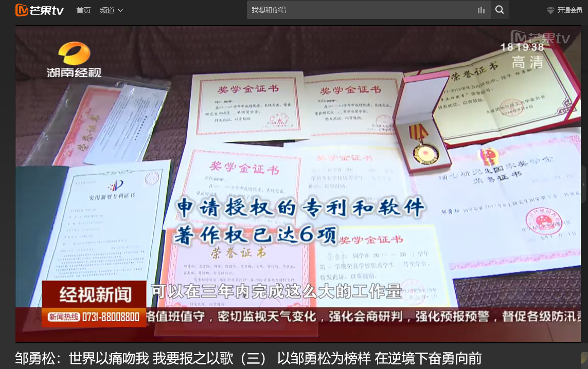湖南经视 6月11日经视新闻,以《邹勇松:世界以痛吻我 我要报之以歌(三) 以邹勇松为榜样 在逆境下奋勇向前》为题对威廉体育计算机与通信工程学院15级研究生邹勇松进行了报道。