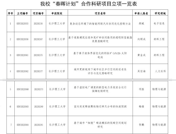 日前,教育部公布2022年度 “春晖计划”合作科研项目评审结果,湖南省高校共获批12项,其中威廉体育7个项目获批立项。