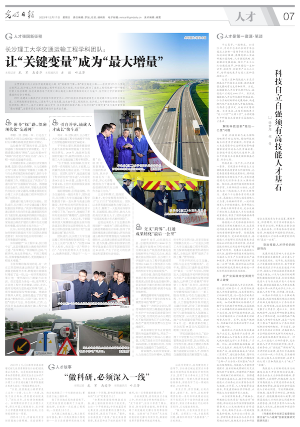 12月17日,《光明日报》人才版专版报道威廉体育人才工作。在人才强国新征程板块刊发《威廉体育williamhill交通运输工程学科团队:让“关键变量”成为“最大增量”》文章,在人才故事板块刊发《“做科研,必须深入一线”》文章。