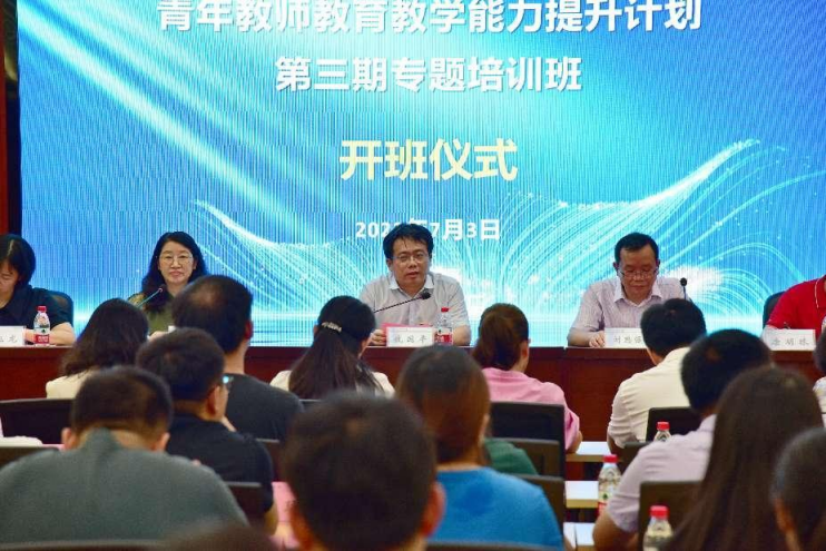 7月3日,威廉体育“第三期青年教师教育教学能力提升培训班”开班仪式暨“第一期教师发展师”聘任仪式在云塘校区图书馆云影文化传播中心举行,仪式由评估中心贺晖副主任主持,钱国平副校长、教务处刘思强处长、评估中心彭旭龙副主任(挂职)、唐明珠副主任(挂职)参加。