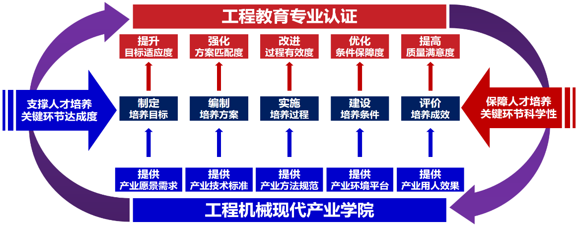 深化校政行企多元协同,提升专业建设水平。确立“面向工程机械产业,培养优质适配人才,服务地方经济发展”的工程机械现代产业学院发展定位,以“高校主导+政府导向+行业协会桥梁+企业参与”为建设范式,成立“校政行企”共同参与的专业建设指导委员会,在多维协作中实现高校新工科人才培养与企业创新发展的合作共赢,机械设计制造及自动化、车辆工程、测控技术与仪器、汽车服务工程等4个专业获批国家一流专业建设点。