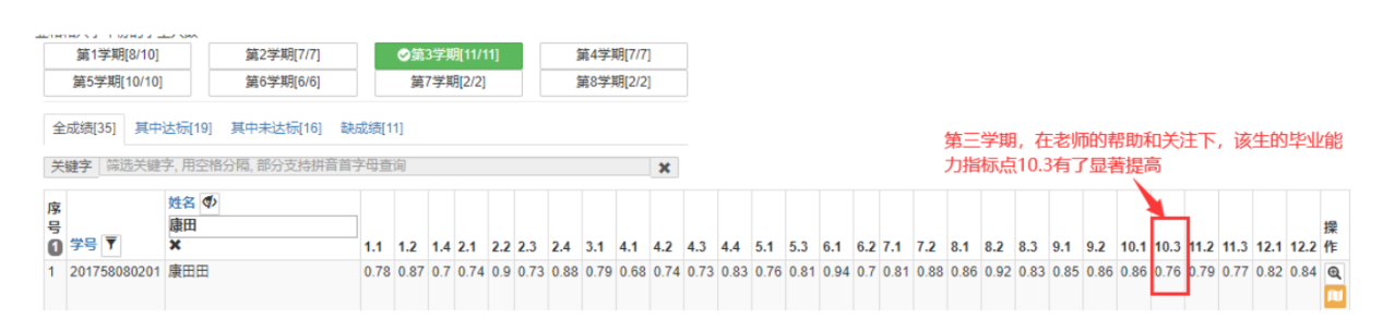 系统可以查询到在该毕业要求指标点上对应的后续课程(见图9),该生的班主任会把这个情况反馈给后续相应课程的老师,帮助该同学在后续课程上更多训练该项能力。针对康田田同学,通过查询系统,后续一个学期支持该毕业要求 10.3的课程为第3学期将开设的《通用工程英语听说(上)》。系统汇总后反馈给班主任,班主任会及时与该任课老师沟通,特别关注该同学在毕业能力10.3上的培养。经过一个学期的督促,在第3学期末,可看到该项毕业要求已经达成(见图10)。