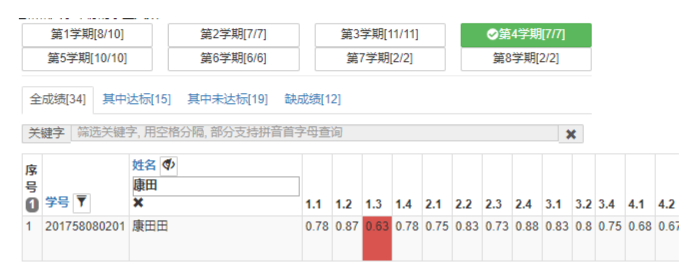 为了督促学生大学四年能达到毕业能力要求,为此针对本专业在校学生,借助学院开发的计易通系统对大学四年每个学期的能力达成情况进行跟踪和评估。下面以 2017 级学生康田田(学号:201758080201)同学为例来说明毕业能力形成性评价过程的评价和跟踪情况。根据课程目标与毕业要求的支撑关系,教师在每学期课程教学完成后,会收集整理本课程目标达成的评价数据,数据通过审核后,由授课老师把数据输入“计易通-工程认证”系统中,评价学生课程目标达成情况。这样系统就可以统计出学生该学期的所有课程目标能力达成评价值,根据能力达成标准,如果计算出该学生的某毕业要求达成评价值有小于预设值的情况,则把该生设置为预警学生,同时把该毕业要求能力点设置成高亮度。图8给出了该生第 2 学期的达成评价数据。从图中可以看出该生毕业要求指标点10.3 小于预设值 0.66,表明该能力这学期没有达到毕业要求,需要在后续的学期中重点关注该同学这个毕业要求能力指标点的培养。