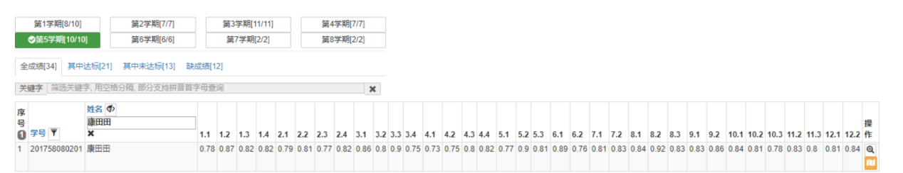 图11显示该同学在第4学期期末的毕业要求指标点1.3小于预设值 0.66,表明该能力这学期没有达到毕业要求,按照同样的方式,需要在后续的学期中重点关注该同学这个毕业要求能力指标点的培养。如此环环相扣,及时掌握学生每学期的能力达成的情况。到第5学期时,该生的毕业要求能力点已全部达标见图12。