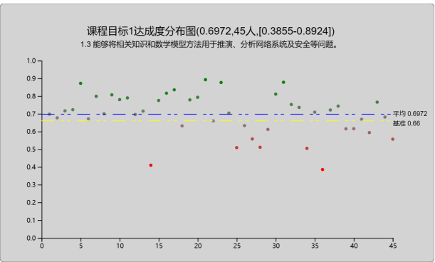 (1)系统协助教师完成课程目标达成评价,以散点图形式展示学生各个课程目标能力达成的分布图,以折线图形式展示该课程的全部课程目标的分布情况,并自动生成课程目标达成评价报告。