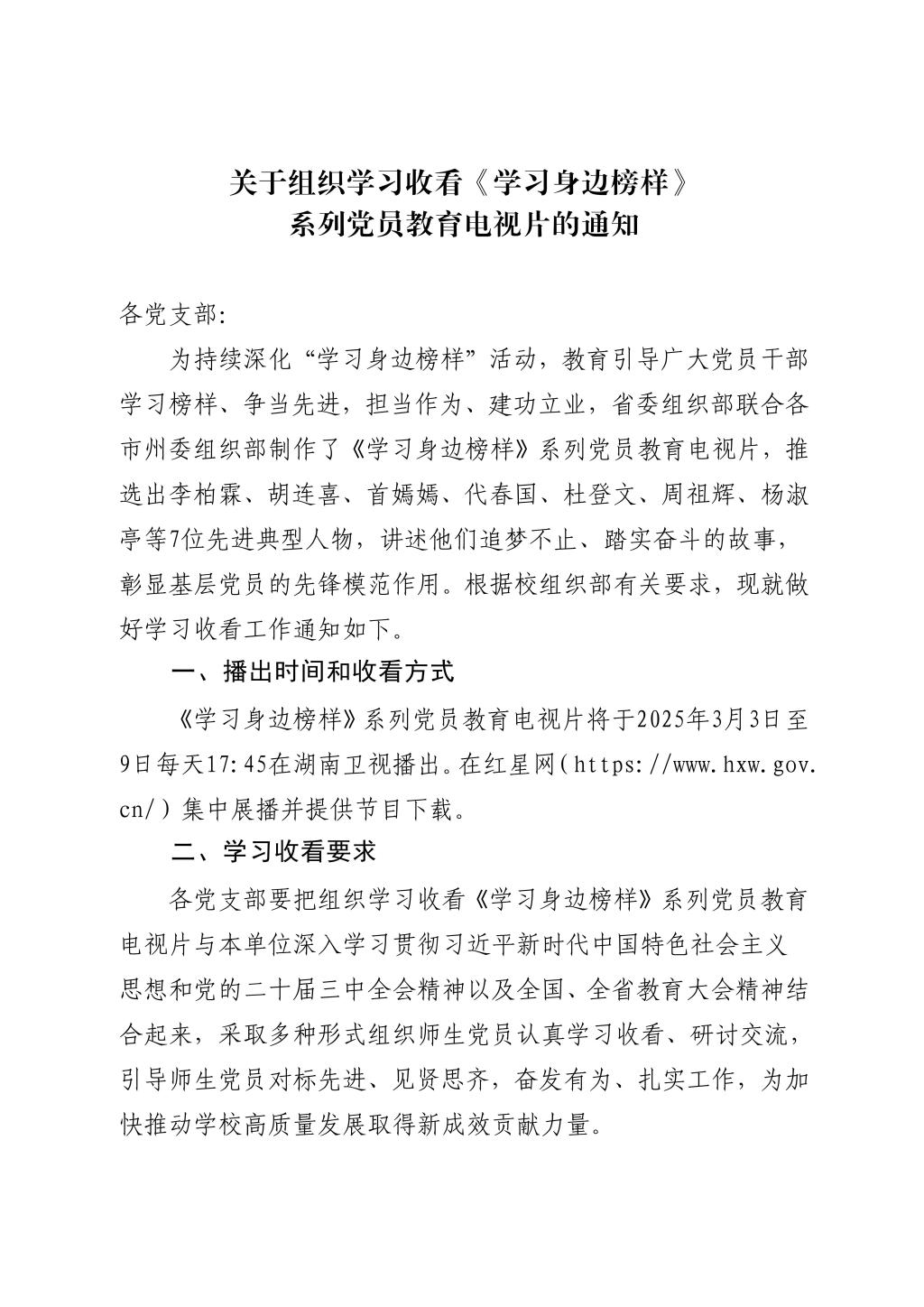 关于组织学习收看《学习身边榜样》系列党员教育电视片的通知