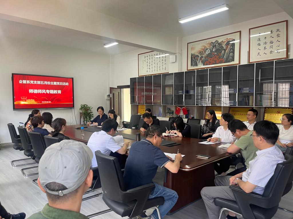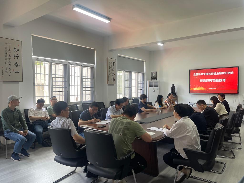 5月14日下午,经管学院企业管理系在金盆岭校区经管大楼207召开师德师风专题法纪教育学习会,会议由支部书记李祝平主持,全系教师参加。