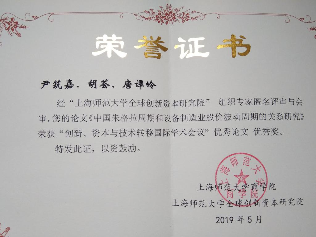 经济与管理学院学生胡荟、刘丽娟和韩露露参加了此次国际学术会议,其中胡荟的参会论文《我国朱格拉周期与设备制造业股价波动周期的关系研究》(指导老师:尹筑嘉)在北京、上海、湖南和江苏等地高校的论文角逐中经论坛的专家匿名评审和终审被评选为优秀论文。