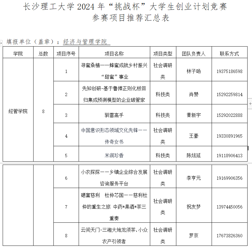 2024年3月11日,经管学院举办2024年“挑战杯”大学生创业计划竞赛,经过答辩展示,学院讨论,综合评选出以下项目入围推荐校赛名单,公示如下:公示期三天,公示期内如有相关问题可联系何涛老师反馈,电话:85222309.
