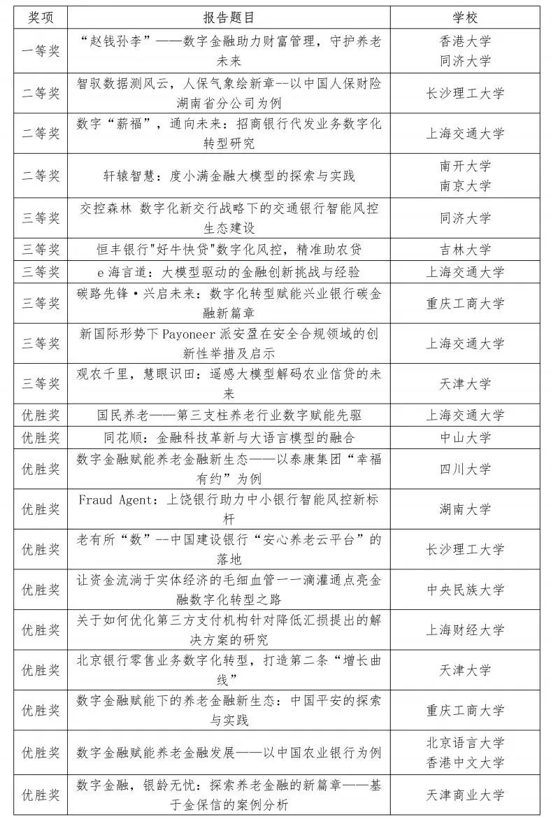 本次大赛吸引了来自全国逾百所高校共250支队伍报名参赛,经过文本初筛、网络初赛等环节,最终来自上海交通大学、香港大学、同济大学、南开大学、南京大学、中山大学、天津大学、湖南大学、上海财经大学等17所高校的21支队伍晋级决赛。其中,我院共两支队伍进入决赛。入围全国决赛的作品分别聚焦“人工智能大模型应用”“金融机构数字化转型”“促进跨境支付便利”“数字金融赋能养老金融发展”四个主题方向。