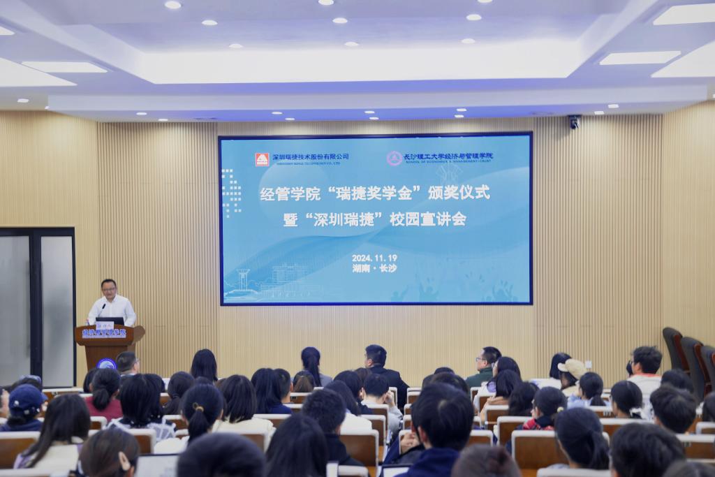 11月19日下午,经管学院“瑞捷奖学金”颁奖仪式暨“深圳瑞捷”校园宣讲会在经管大楼 100 报告厅举行。深圳瑞捷技术股份有限公司是威廉体育williamhill产学研用合作校友企业,是一家提供专业的第三方评估和项目管理服务的高新技术企业、上市公司。该公司董事长范文宏是威廉体育94级校友,“瑞捷奖学金”的成立体现了范文宏董事长对母校的深情厚谊,也体现了深圳瑞捷技术股份有限公司对教育事业的关心。