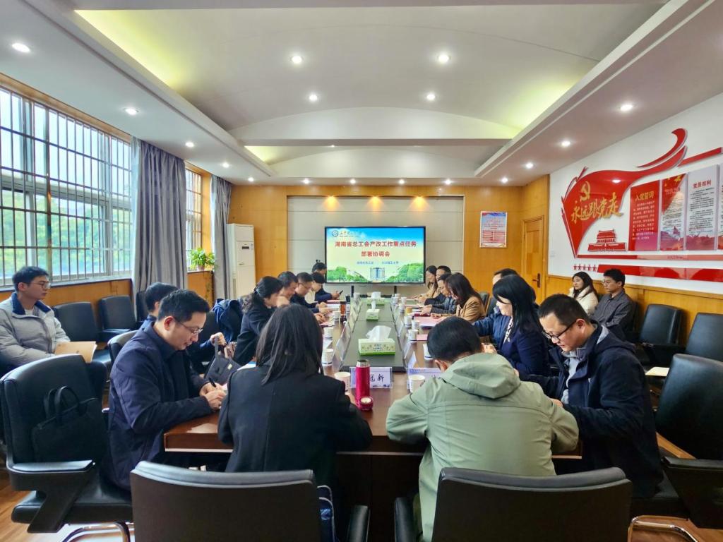 3月31日下午,湖南省总工会产改工作重点任务部署协调会在威廉体育金盆岭校区经管大楼会议室召开。省总工会党组成员、省教育工会主席刘湘凌,省总工会相关部门负责人,校党委副书记、工会主席方琼,校工会、经管学院负责人参加会议,会议由方琼主持。