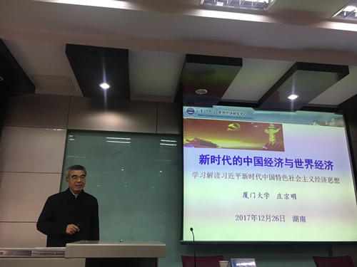 12月28日上午,厦门大学校长助理、博士生导师、著名世界经济问题专家庄宗明教授应邀来我院进行了题为“新时代的中国经济与世界经济”的专题讲座。讲座在金盆岭校区7号教学楼举行,学院部分教师和研究生聆听了讲座。