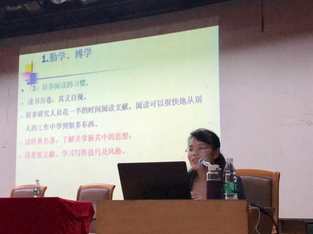 陈银娥的讲课紧紧围绕“博学慎思、勤学笃行”展开,主要阐述“为什么读研”、“为学的几个层次”、“研究生教育的根本”、“关于学术、成长的建议”以及“关于导师的作用”。在授课过程中,陈银娥提出了为学的几个层次:“博学、审问、慎思、明辨、笃行”,并强调“研究生为学要弘扬科学精神,以无用之用的境界领悟科学的愉悦;为人要弘扬人文精神,以人为本,尊重人格,崇尚德性。”鼓励全体研究生肩负起新时代下的新使命和责任,不断提升,追求卓越。此外,她还结合自己的教学经验和人生经验深入浅出的为18级全体研究生具体讲述了如何读书、如何进行论文创作、如何成长以及如何与导师相处。