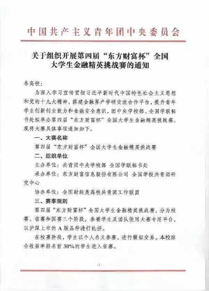 第四届“东方财富杯”全国大学生金融精英挑战赛是由团中央学校部、全国学联秘书处主办、东方财富信息股份有限公司、全国学校共青团研究中心联合承办,全国财经类高校共青团工作联盟协办、Choice数据提供数据支持的一项全国性青年学生创新创业能力比赛。该比赛由参赛者使用大赛专用平台,以竞赛期间A股交易收益率水平作为比赛成绩。比赛分为校赛,省赛和国赛三个阶段,2018年9月10日开始,2018年12月21日结束。威廉体育共有146位同学参加了本次比赛,其中28支队伍晋级省赛,2支队伍晋级国赛。