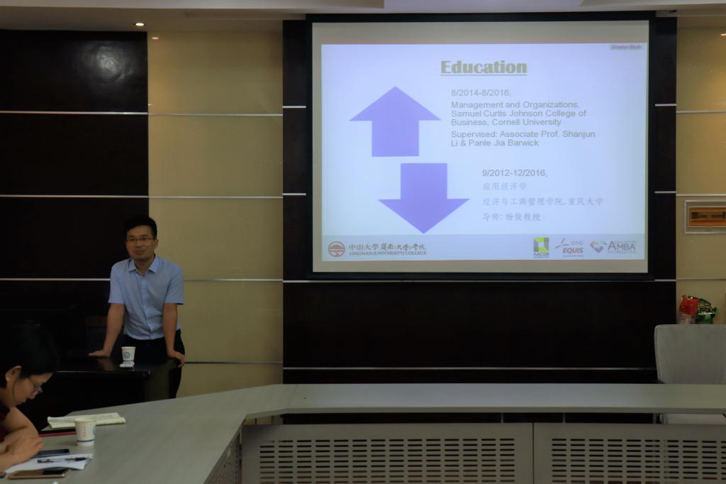 2019年5月16日下午4点30分,中山大学岭南(大学)学院副研究员、世界顶级管理学期刊(Strategic Management Journal、Academy of Management Perspectives等)作者黄守军博士应邀来我院做学术讲座,主题为“异质电力减排竞争及其概率定价”,在金盆岭校区七教204开展讲座。本次讲座由张新华副院长主持,经管学院唐文彬、刘洪深等老师及硕士、博士研究生参加了本次讲座。